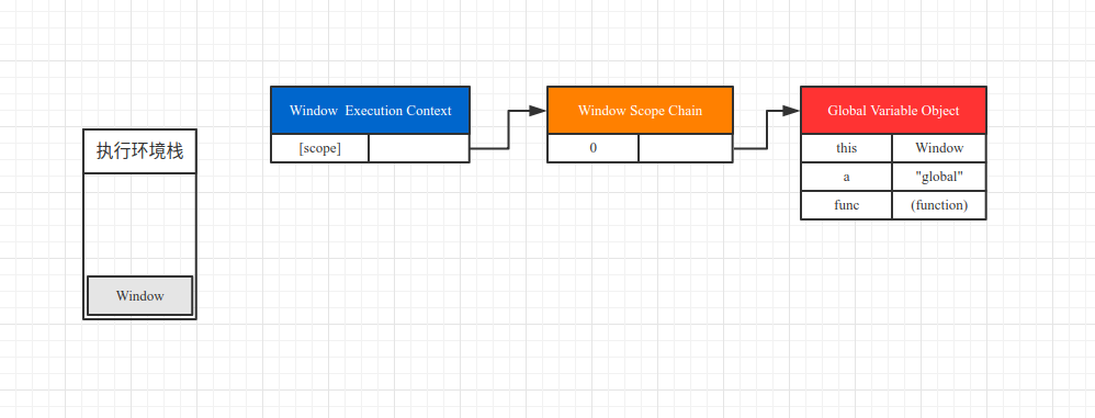 当浏览器运行解析 example.js 后,首先创建了全局执行环境 (Window 对象)、Window 作用域链和 Global 全局活动对象,如图: