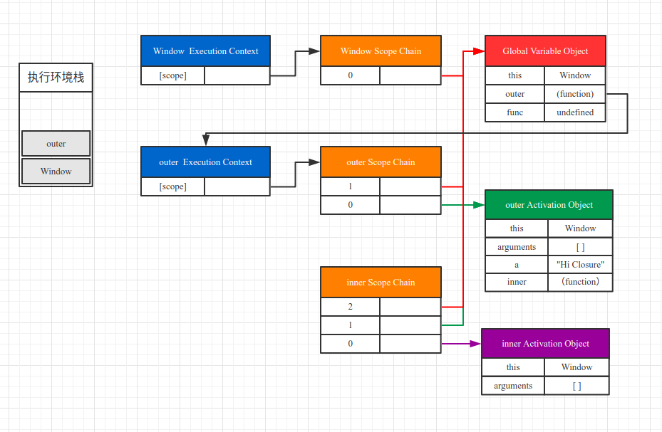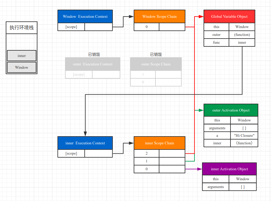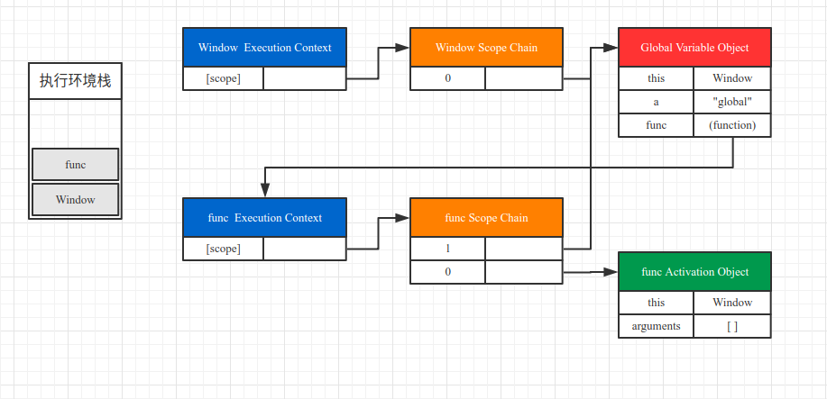 最后,当 func 函数执行完毕,其执行环境被环境栈弹出,func 执行环境对象、func 作用域链、func 活动对象全部随之销毁。