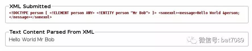 2. 上面说这是一个XML验证器。让我们试着提交样例测试看看会发生什么。在XML框中,我们输入<somexml><message>HelloWorld</message></somexml>,然后点击Validate XML。在解析的结果中它应该只显示Hello World: