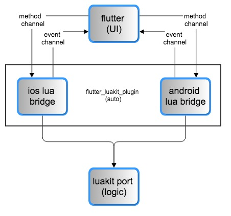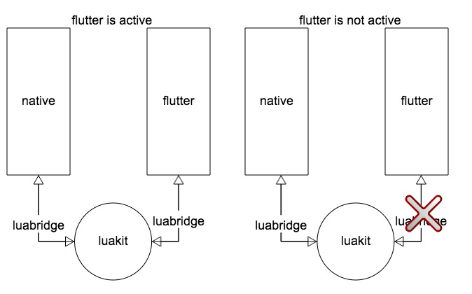做完一个版本纯flutter之后,我意识到可以用一种新的开发模式来进行flutter开发,这样可以避免我上面提到的两个问题,我们团队马上付诸实施,做了另一个版本的flutter+luakit的尝试,即用flutter做界面,用lua来写逻辑,结构图如下。