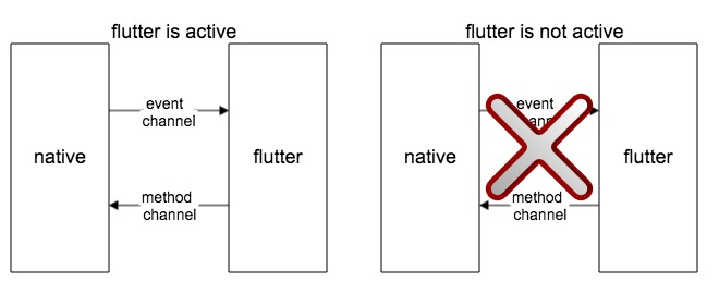 - 当一个已有的app要接入flutter,必然会产生一种情况,就是flutter体系里面的数据和逻辑,跟外部原生app的逻辑是不通的,简单说明一下,就是flutter写的业务逻辑通常是用dart语言写的,我们在原生用object-c、swift或者java、kotlin写的代码是不可以脱离flutter的界面调用dart写的逻辑的,这种互通性的缺失,会导致很多数据联动做不到,譬如原生界面要现实一个flutter页面存下来的数据,或者原生界面要为flutter页面做一些预加载,这些都很不方便,主要是下图中,当flutter界面没调用时,从原生调用flutter接口是不允许的。