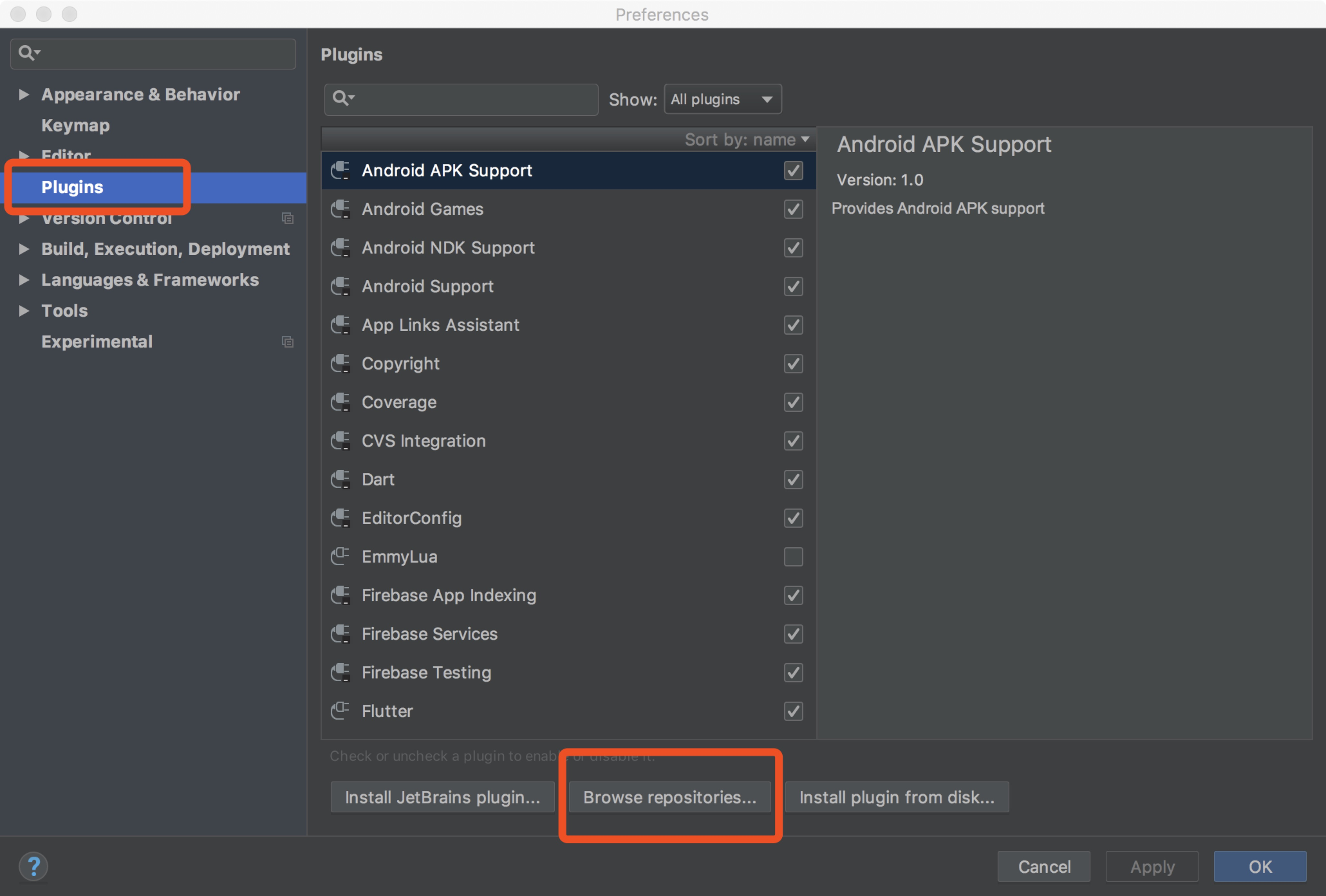 AndroidStudio->Preference..->Plugins->Browse reprositories...
