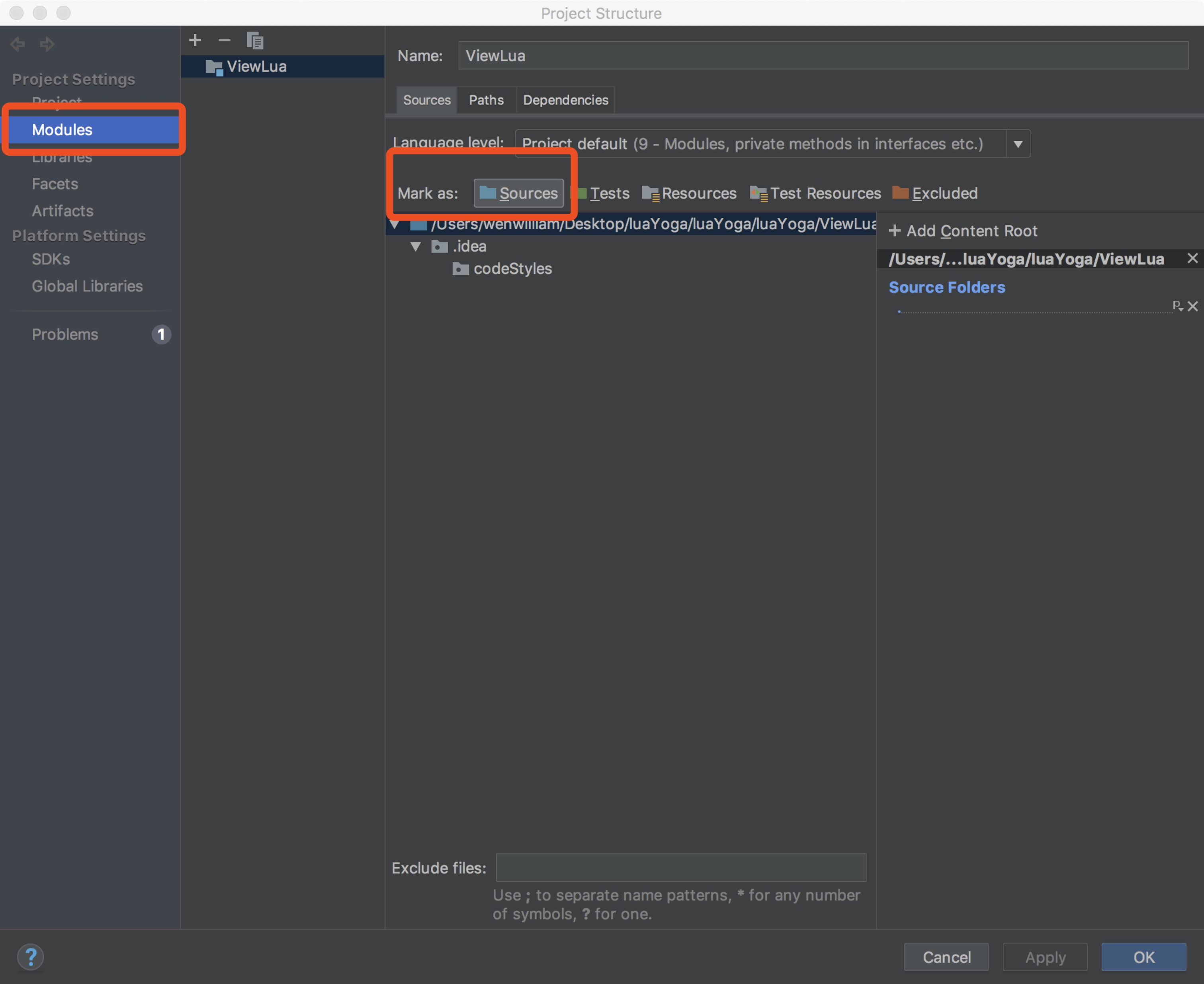 选择 Modules、 Mark as Sources