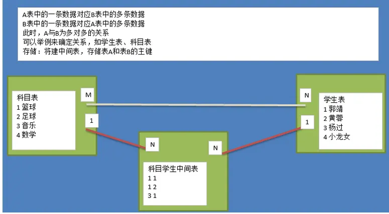 实体A对实体B为多对多:新建一张表C,这个表只有两个字段,一个用于存储A的主键值,一个用于存储B的主键值