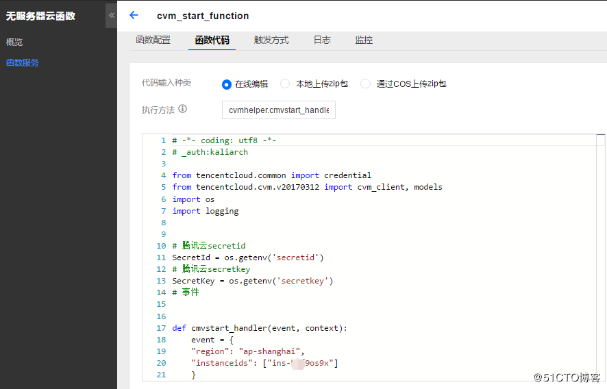 在此我利用腾讯云的CVM的SDK进行了云服务器的停止与开机操作,代码的输入支持在线编程,以及本地zip上传和cos上传代码 ** 注意**:如果为本地代码调用的二进制或可执行文件,需要打包一并上传。