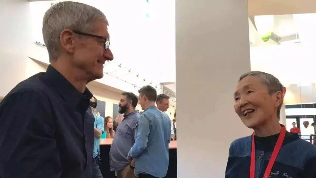 同年 6 月,一身红衣的她,现身苹果全球开发者大会现场。她不亦乐乎地向年轻人展示着她的 APP,笑眯眯地说: