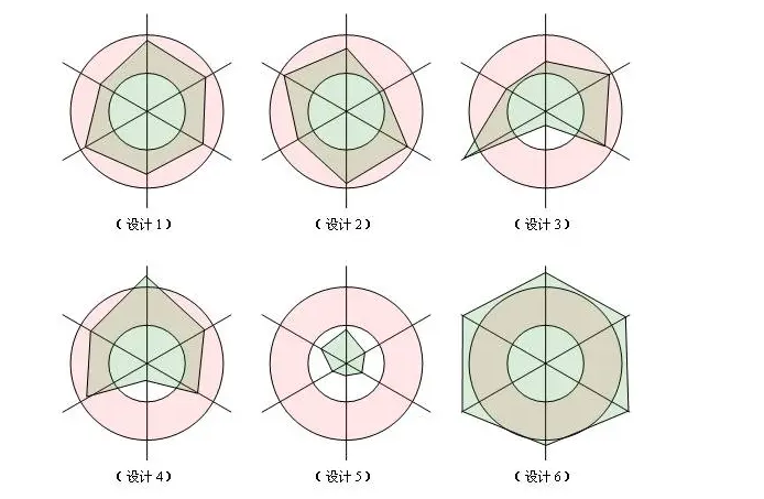 图中的每一条维度各代表一项原则,我们依据对这项原则的遵守程度在维度上画一个点,则如果对这项原则遵守的合理的话,这个点应该落在红色的同心圆内部;如果遵守的差,点将会在小圆内部;如果过度遵守,点将会落在大圆外部。一个良好的设计体现在图中,应该是六个顶点都在同心圆中的六边形。
