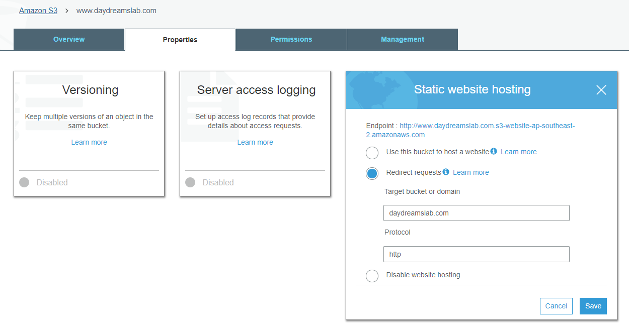 The second bucket (www.mywebsite.com) we will leave empty but configure to redirect to our first bucket using HTTP as the protocol (we’ll make it HTTPS later).