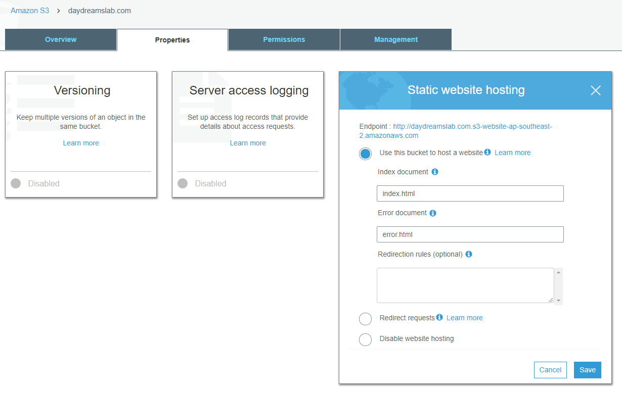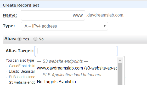 Note: If your domain is registered with another domain registrar (not Amazon) you’ll need to follow some different steps to set this up. Usually you’ll need to add a CNAME record with a value of the main S3 buckets endpoint.