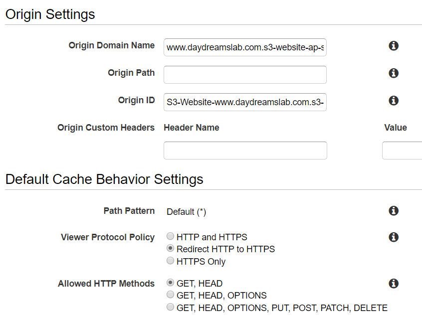 - Origin Domain Name: Set this to the S3 website endpoint for one of the buckets. Important: This field will give you some auto-complete options with your S3 bucket names. However, using these can cause issues with redirecting to the bucket endpoint. So instead use the bucket endpoint directly.