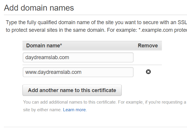 Head to Certificate Manager in AWS Console and request a new public certificate (this is free). You’ll be prompted to enter the domain names you wish to secure.