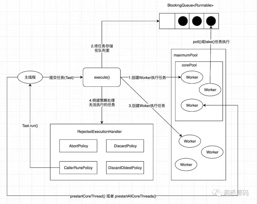 一般在任务被提交后,线程池会利用线程工厂去创建线程,但当线程池中线程数已为corePoolSize时或maxmumPoolSize时不会。可以在任务提交前通过prestartCoreThread方法或prestartAllCoreThreads方法预先创建核心线程。具体可以参考这下这个图: