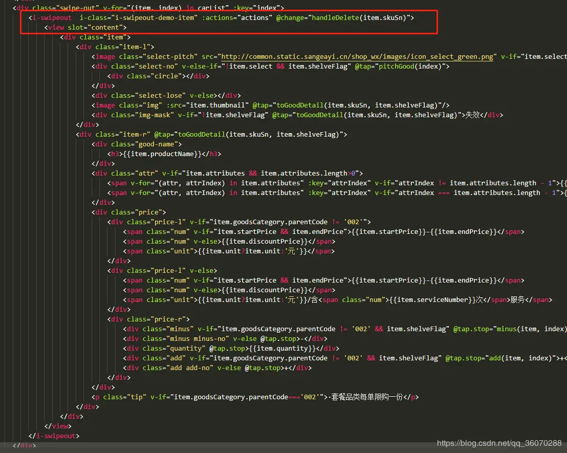 - 注意,删除的事件应该写在标签上,如上面的@change写在i-swipeout标签上,当点击红色区域带上相应的参数做删除操作,代码如下