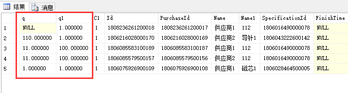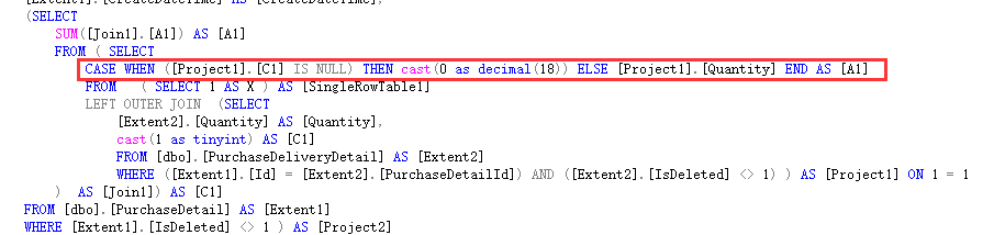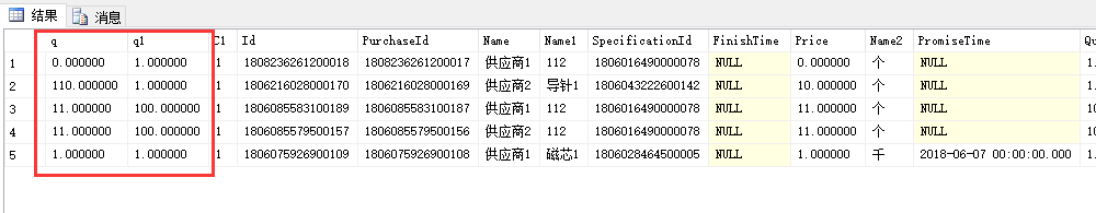 x => x.DeliveryDetails.Where(w => !w.IsDeleted).Sum(s=>s.Quantity) < x.Quantity于是把生成的sql复制出来稍作修改执行了一下,结果如下(q是上面sum()的结果,q1是上面x.Quantity的结果)