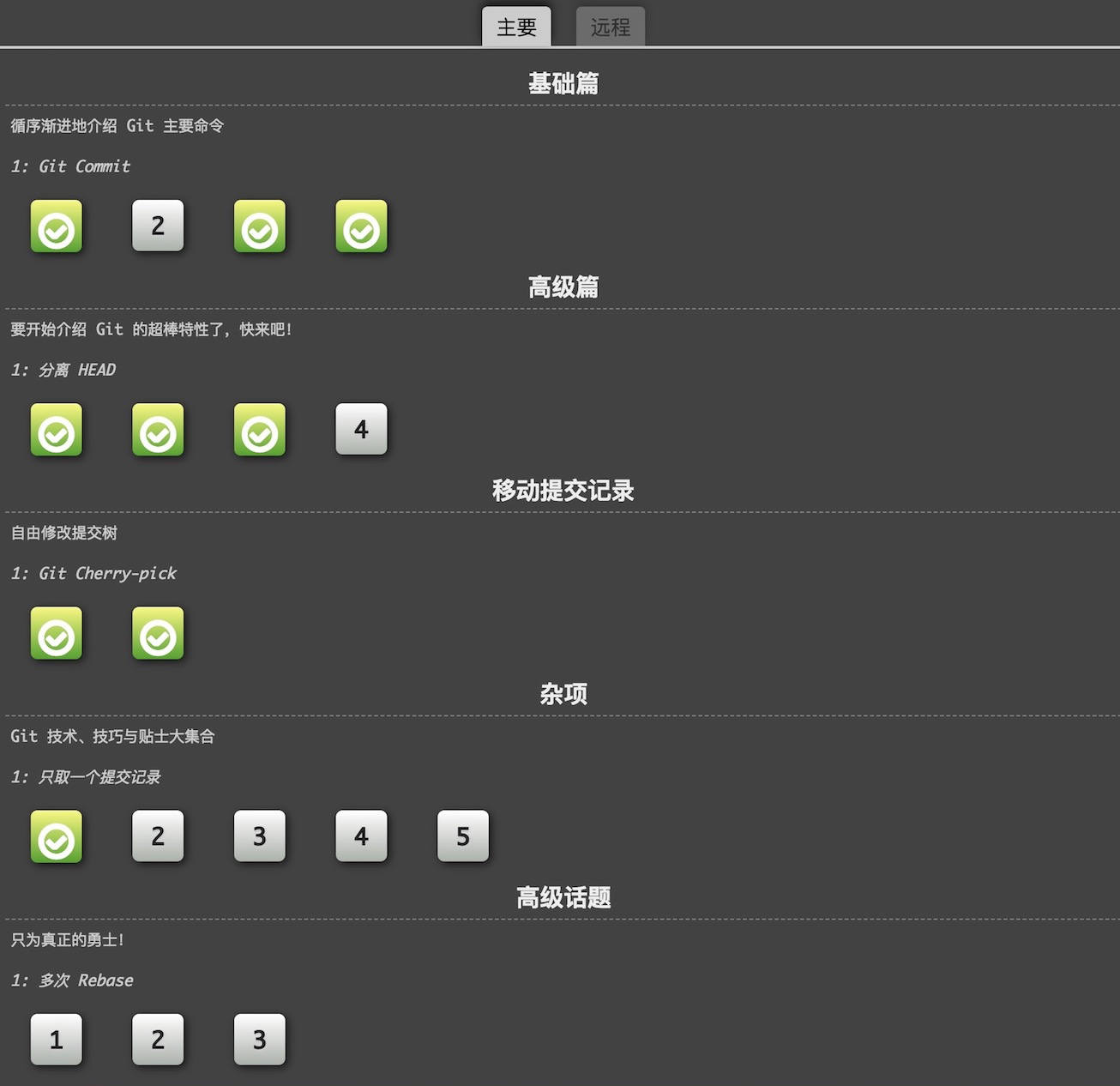 可视化学习Git zhangyongxing89 2019-01-10 1,991 阅读1分钟 给大家推荐一个Git学习工具LearnGitBranching,以可视化的方式讲述Git的命令原理。并且设置了一系列有挑战性的任务来帮助Git的学习。 先上张图看看效果: 看看它包含的关卡: 详情: 在线的网站 GitHub地址