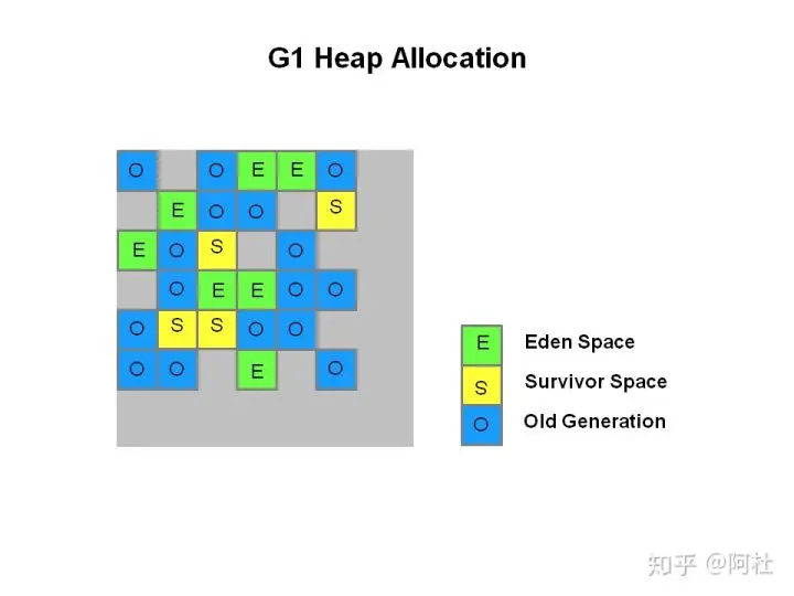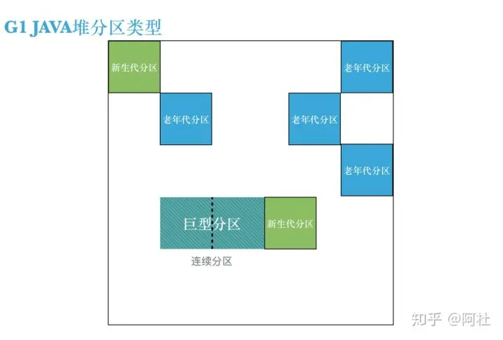 由于巨型对象的存在,G1的堆中的分区就分成了三种类型:新生代分区、老年代分区和巨型分区,如下图所示: