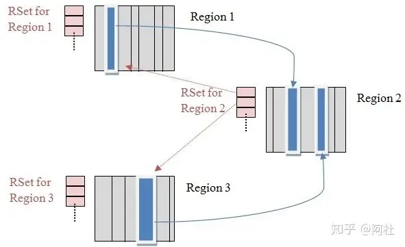 如下图所示,Region1和Region3中的对象都引用了Region2中的对象,因此在Region2的RSet中记录了这两个引用。