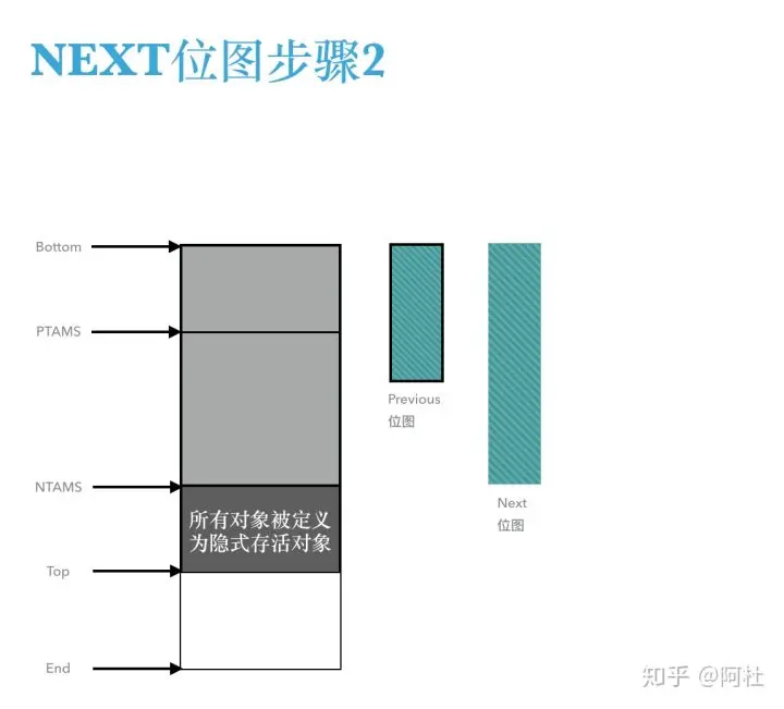 - 位于堆分区的Top和PATMS之间的对象均为隐式存活对象,同时也记录在previous位图中;