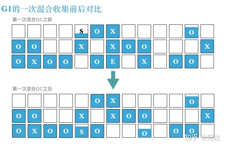 第三、混合收集只会回收一部分老年代分区,下图是第一次混合收集前后的堆情况对比。