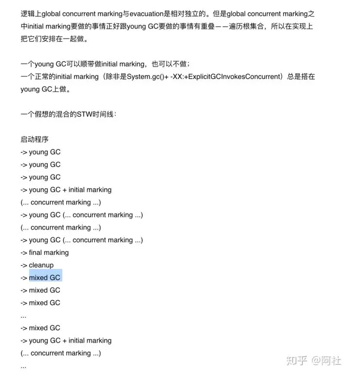 第二、G1的并发标记周期包括多个阶段: 并发标记周期采用的算法是我们前文提到的SATB标记算法,产出是找出一些垃圾对象最多的老年代分区。