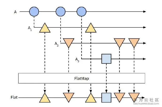 乍看之下会觉得它和merge好像是一样的,其实还是有一些区别的。merge的作用是将多个不同的流合并成为一个流,而上图中A1,A2,A3这三个流都是当主流A返回数据时新生成的,可以将他们想象为A的支流,如果你想在支流里捞鱼,就需要在每个支流里布网,而flatMap相当于提供了一张大网,将所有A的支流里的鱼都给捞上来。