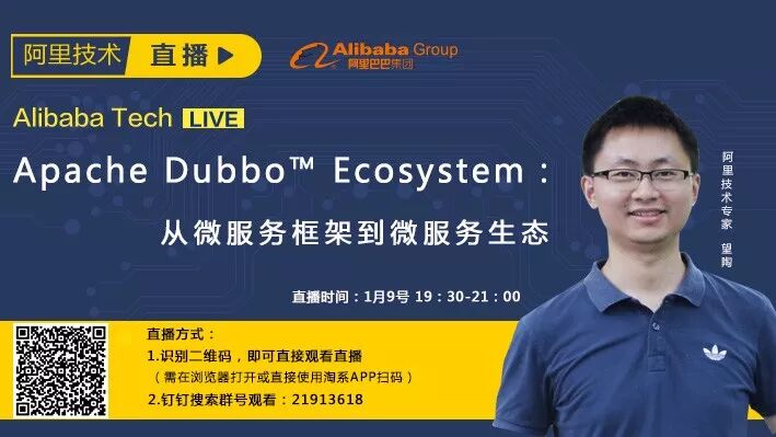 目前,Dubbo正在从一个微服务领域的高性能Java RPC框架演进到一个微服务框架。 1月9日(周三)晚19:30-21:00,欢迎做客阿里技术直播间,共同深入了解全新的 Dubbo Ecosystem。
