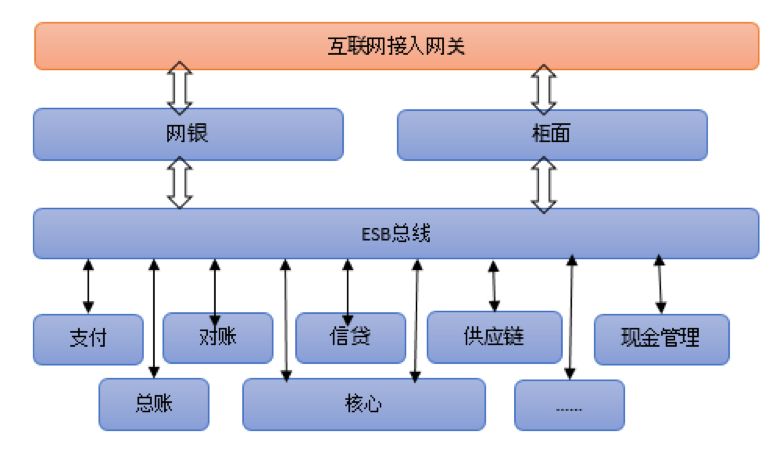 这个阶段引入了ESB总线的理念:ESB总线为渠道、核心和外围系统建立了一座桥梁,提供完全统一的接口标准协议,提升了系统发布的实时性。但同时,ESB成为了最大的单点,要支持大并发高TPS低延时,所以HA和性能要求非常高,变更需要相当谨慎。