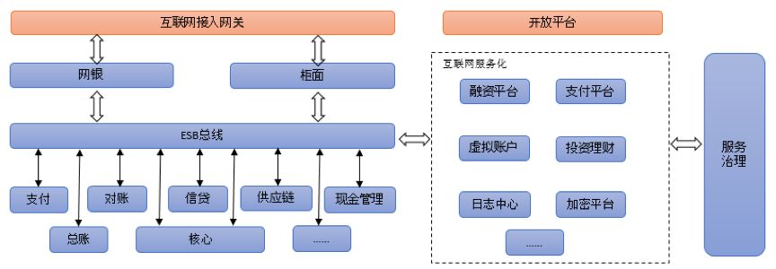 左边是之前的传统银行集中式总线架构,右边是互联网服务化架构,包含了开放平台、服务注册和发现,以及服务化产品系统。
