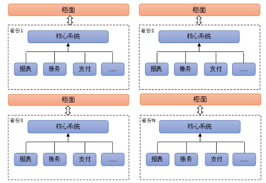 将总行的集中式系统在各个省分行分别都部署一套,每天晚上再以批量处理的方式将各省数据进行集中。