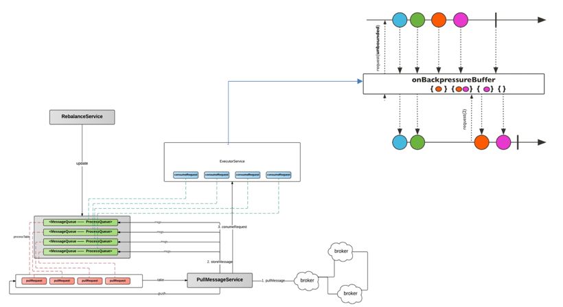 这个时候,我们希望达到一种效果,能够根据后续服务的治理能力决定拉的消息数量。当然RocketMQ的ProcessQ也能达到这个效果,但是还不够精细化。因为在金融场景下,交易一旦出现不一致或者超时,会很麻烦。所以我们希望在实时的交易链路上去解决这个问题。于是我们做了一个类似Reactor框架的背压处理,能够根据处理能力实时拉取消息。