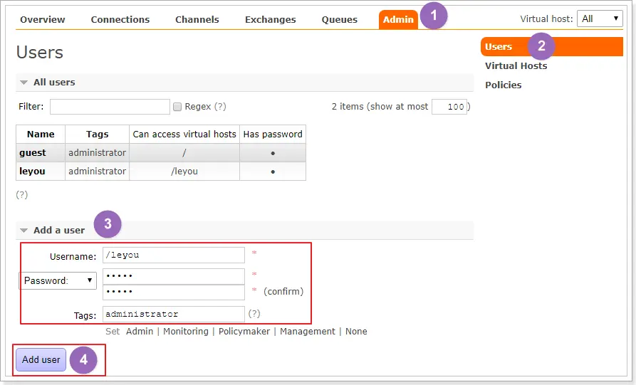 创建好虚拟主机,我们还要给用户添加访问权限:
