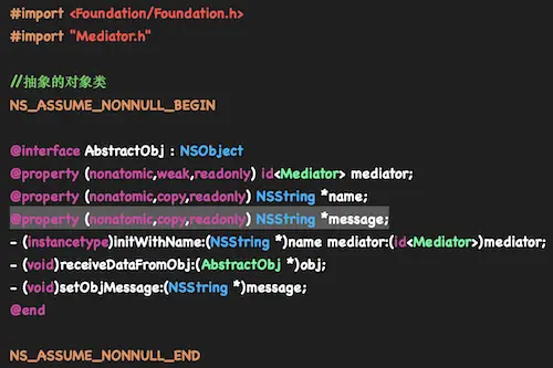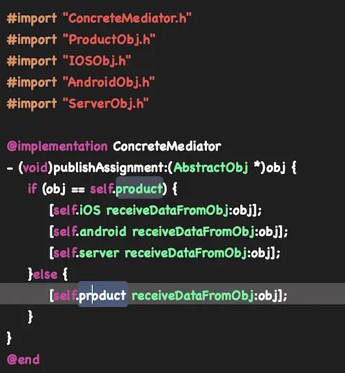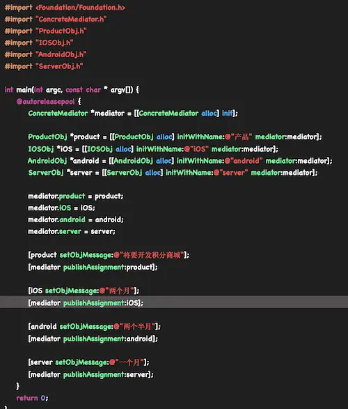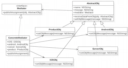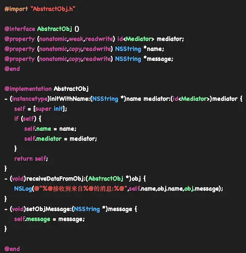 - 各个对象类,实现自己的业务,在需要与其他类通信的时候,就与持有的中介者通信