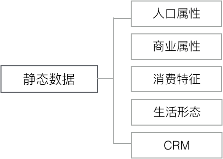 静态数据:包含人口属性、消费特征、生活形态等。指在一定的时间范围内,几乎是不会变化的,比如性别、收入、学历等等,涉及人口或者其他属性,属于自成标签,一般通过用户的注册就可直接获得。