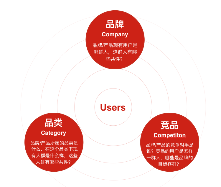 「用户画像」是依据企业特质而量体裁衣的,画像结果能否帮助企业导出因果关系的产品定义及运营策略才是有效的。行业与竞品研究是为了从宏观角度,对本行业消费者有初步的了解,奥美公关数据分析总监王泽蕴在《不做无效的营销》中将研究维度概括为品牌(Company)、品类(Category)、竞品(Competiton),即通过三C视角勾勒人群画像。