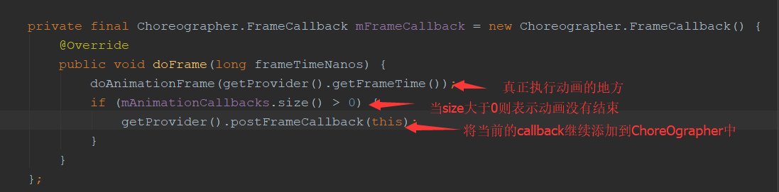 - 当VSYNC信号到来是执行ChoreOgrapher.FrameCallback,当步骤二中的列表size大于0,表示动画尚未结束,继续步骤二 。代码如下: