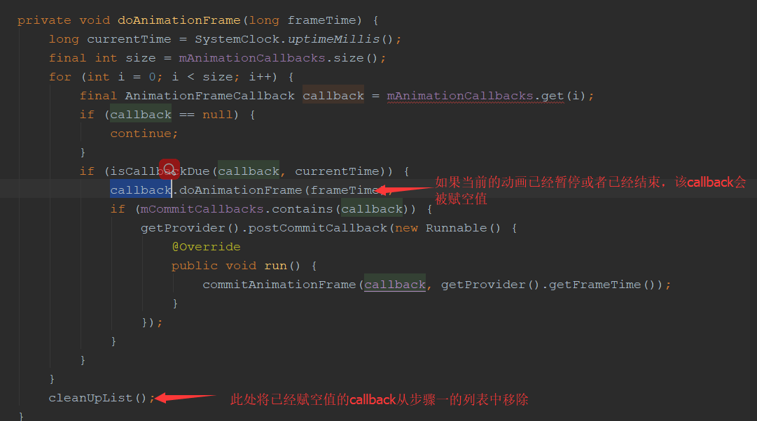 - 这一步骤会调用ValueAnimator中的doAimationFrame方法,如果当前动画暂停,或者动画已经执行结束,会调用removeAnimationCallback将当前的callback赋空值,然后从步骤1中的列表移除掉,否则执行步骤5