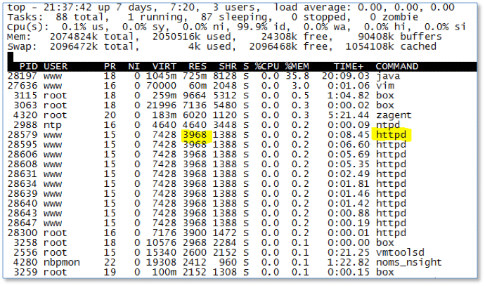 当然这也取决于Apache加载的模块类型和数量。以NHN的Web服务为例,把Apache当作简单的代理使用,根据上图RES显示,4M空间对于每个httpd进程来说已足够使用。因此700M空间能设置的MaxClients为175。