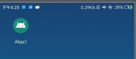 可以看到只显示这一个入口了,但是如果大家在点了"ALIAS_1"之后,马上就返回到主页看盯着这个app的图标,我们会发现在它在大概10s内是没有变化的,在大概10s后才更新成我们切换的那个图标,还有,在它没更新成功的时候如果我们点这个原来的图标,一般会吐司一条“未安装”之类的信息(华为是未安装),这里我的小米是点了没有反应,要等大概10s秒后更新成功了才能点这个图标进入应用。所以,通过代码我们"已经做到了"图标的切换,但是!!!