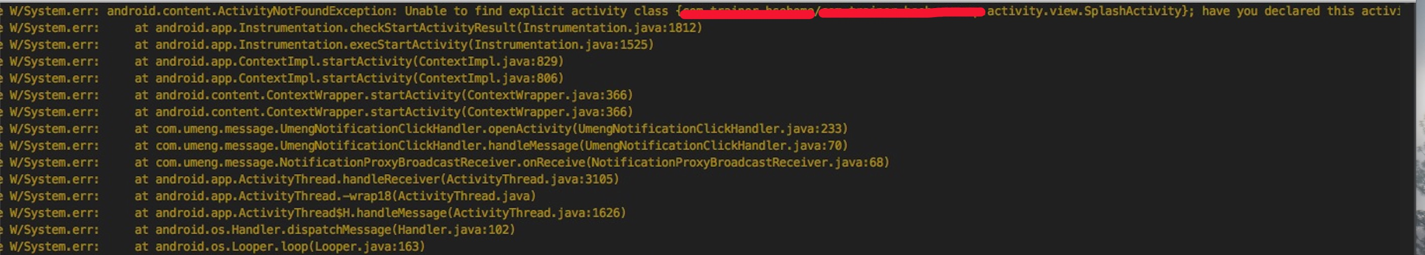8、设置enabled为false的Activity无法在代码中通过显式intent打开,会报错。例如:我在应用里面推送服务推送了一条指定打开页面SplashActivity的通知消息,而这个SplashActivity刚好设置了enabled为false的话,是打不开的,会有错误日志如下,其它同理(所以在项目里我将启动入口的Activity单独写出来了,除了作为启动入口用,就没有别的地方再用到这个Activity了。):