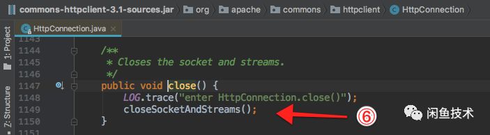 alwaysClose这个值是如何影响到我们关闭连接的动作呢?继续跟踪下去,发现HttpMethodBase(它的多个实现类分别对应HTTP中的几种方法,我们最常用的是GetMethod和PostMethod)中的releaseConnection()方法首先会尝试关闭响应输入流(下图中的①所指代码),然后在finally中调用ensureConnectionRelease(),这个方法内部其实是调用了HttpConnection类的releaseConnection()方法,如下图中的标记③所示,它又会调用到SimpleHttpConnectionManager的releaseConnection(conn)方法,来到了最关键的标记④和⑤。