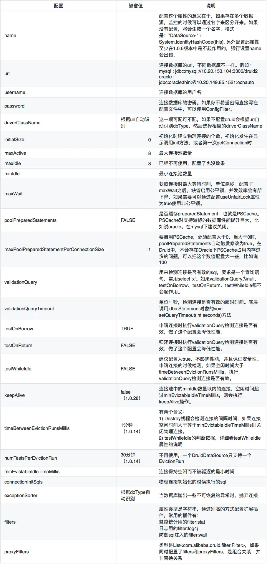 属性类型是字符串,通过别名的方式配置扩展插件,常用的插件有:监控统计用的filter:stat日志用的filter:log4j防御sql注入的filter:wall