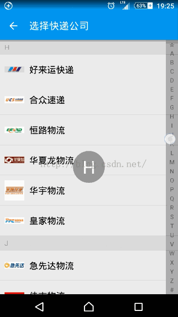 继承自LinearLayout,添加了26个字母索引TextView,当手指滑动时通知Activity更新界面。 核心是OnTouchListener,手指滑动的时候根据当前Y坐标计算出手指所在的索引位置,要注意临界值。