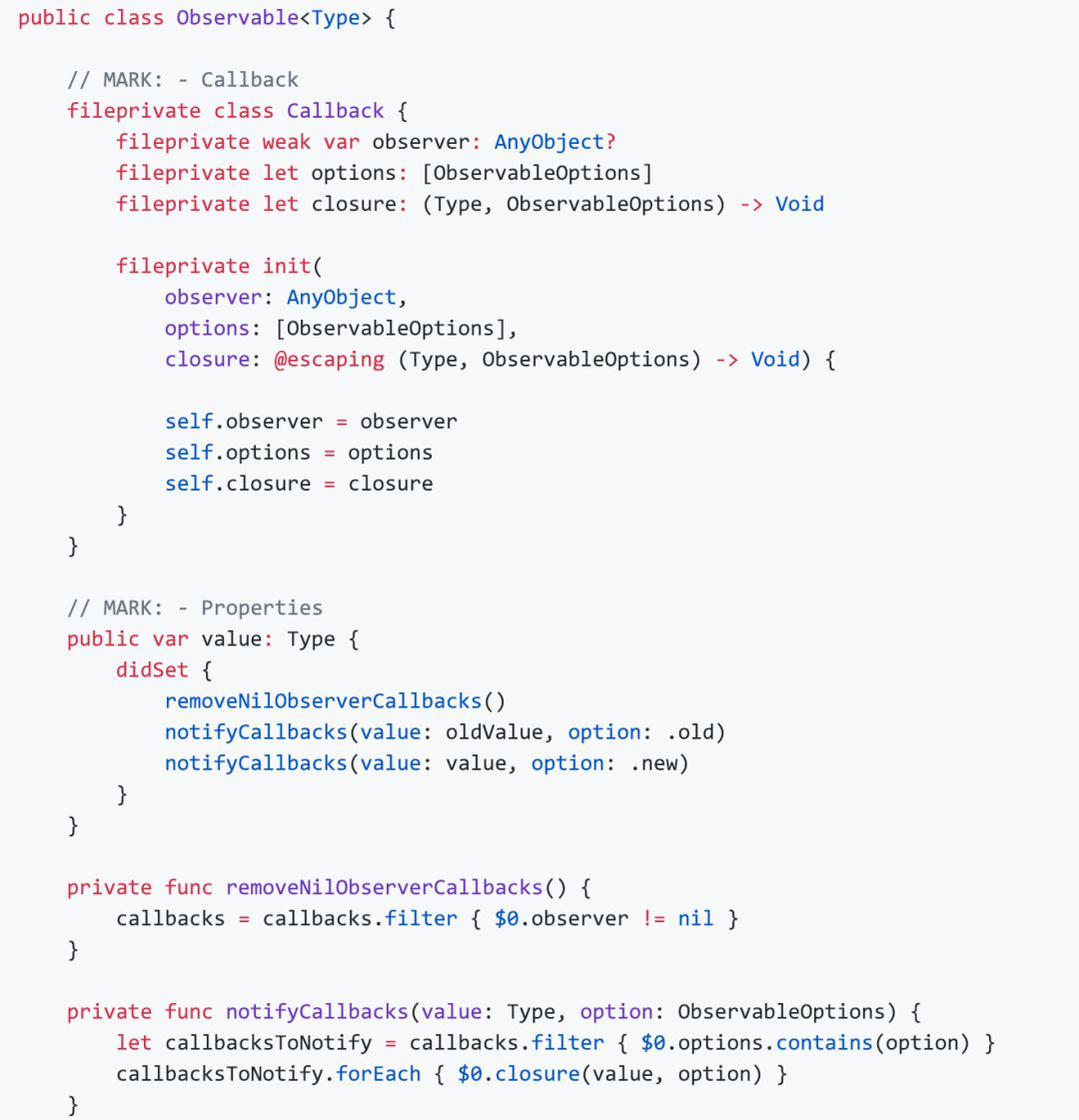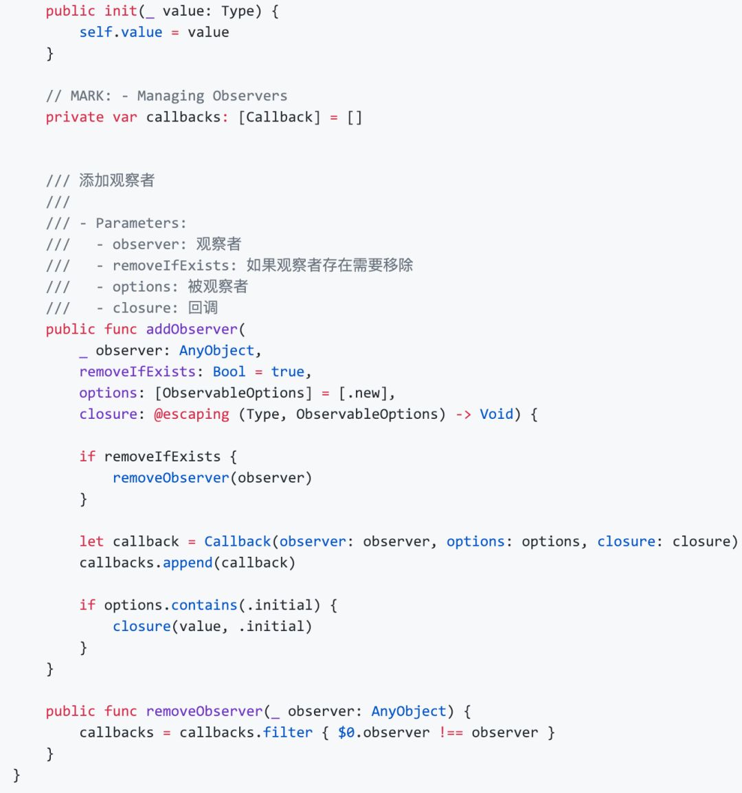 Swift 并没有在语言层级上支持 KVO,如果要使用必须导入 Foundation 框架,被观察对象必须继承自 NSObject,这种实现方式显然不够优雅。