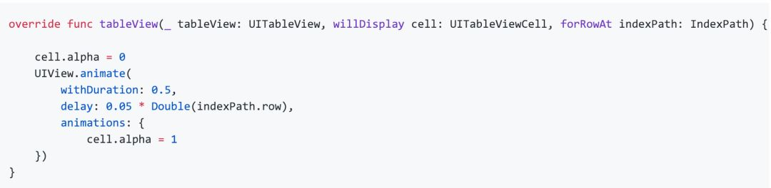 最后我们就可以在tableView(_:,willDisplay:,forRowAt:)这个方法中使用如下代码,就实现最终效果