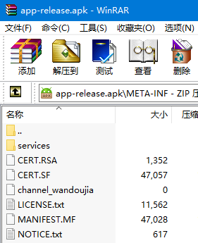 添加完空渠道文件后的目录,META-INF目录多了一个名为channel_wandoujia的空文件: