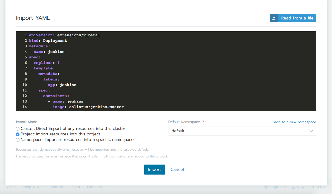 现在,点击Import YAML。在接下来的页面中,点击右上角的Read from a file按钮。选择在本地创建的deployment.yml文件并点击Import。