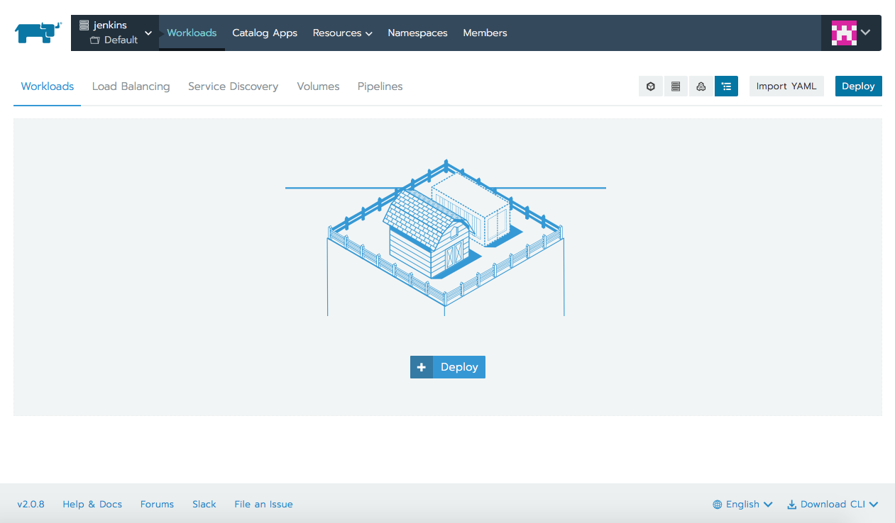 app: jenkins在Rancher上,点击自己管理的集群(例子中名为jenkins)。在左上角的菜单中,选择Default项目,然后选择Workloads选项卡。