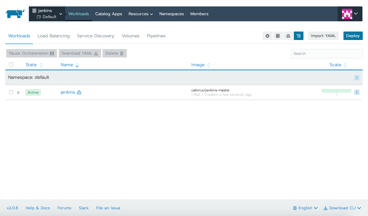 在集群准备好之后,我们就可以部署Jenkins master和创建一些服务了。如果你对kubectl比较熟悉,你可以直接用命令行来实现;不过通过Rancher的UI,你也能很容易地部署所有需要的组件。