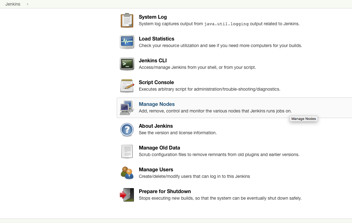 点击Manage Nodes之后的Manage Jenkins。