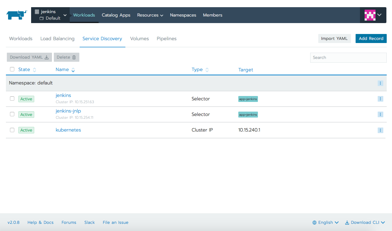现在,切换到Rancher UI。在左上角菜单中,选择Jenkins集群上的Default项目。在上方的导航窗口中选择Workloads选项卡,然后单击页面上的Service Discovery选项卡: